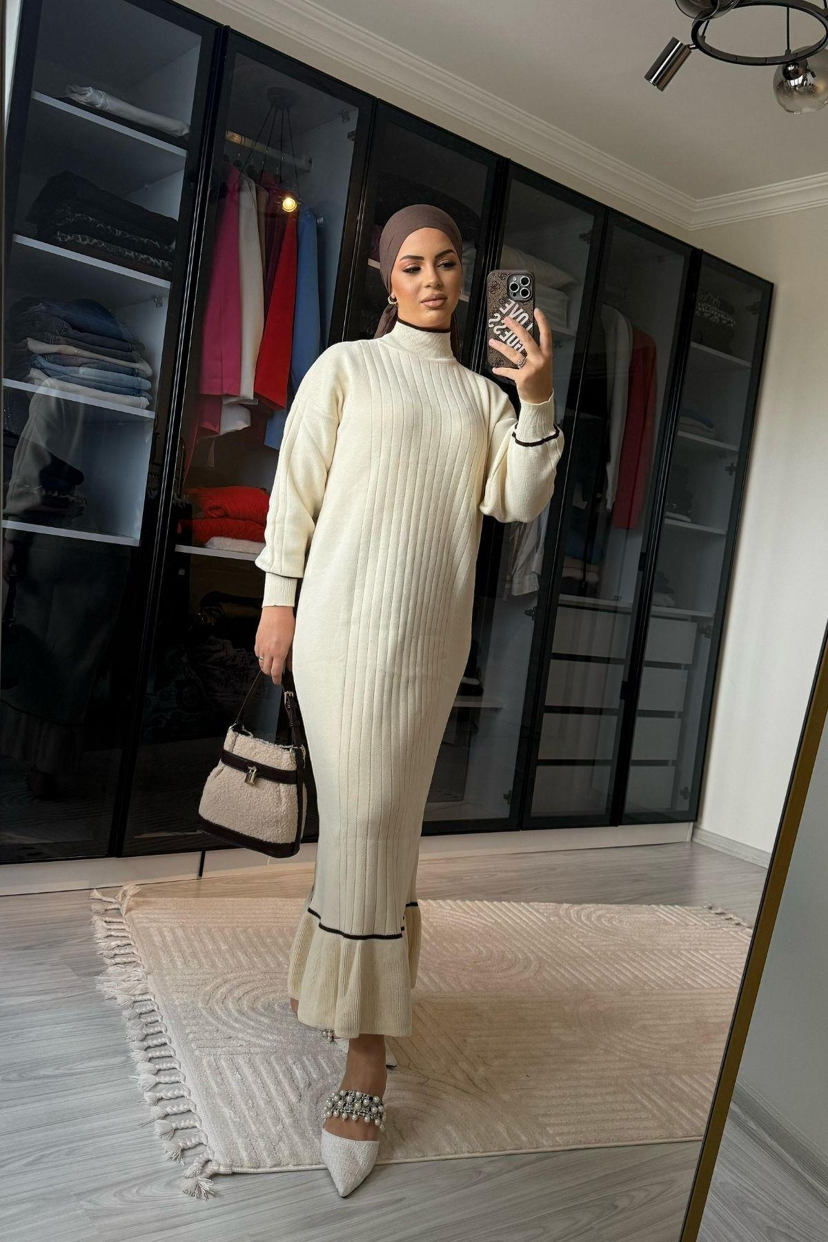 Kadın Beyaz Düz Fırfırlı Triko Elbise (7081)