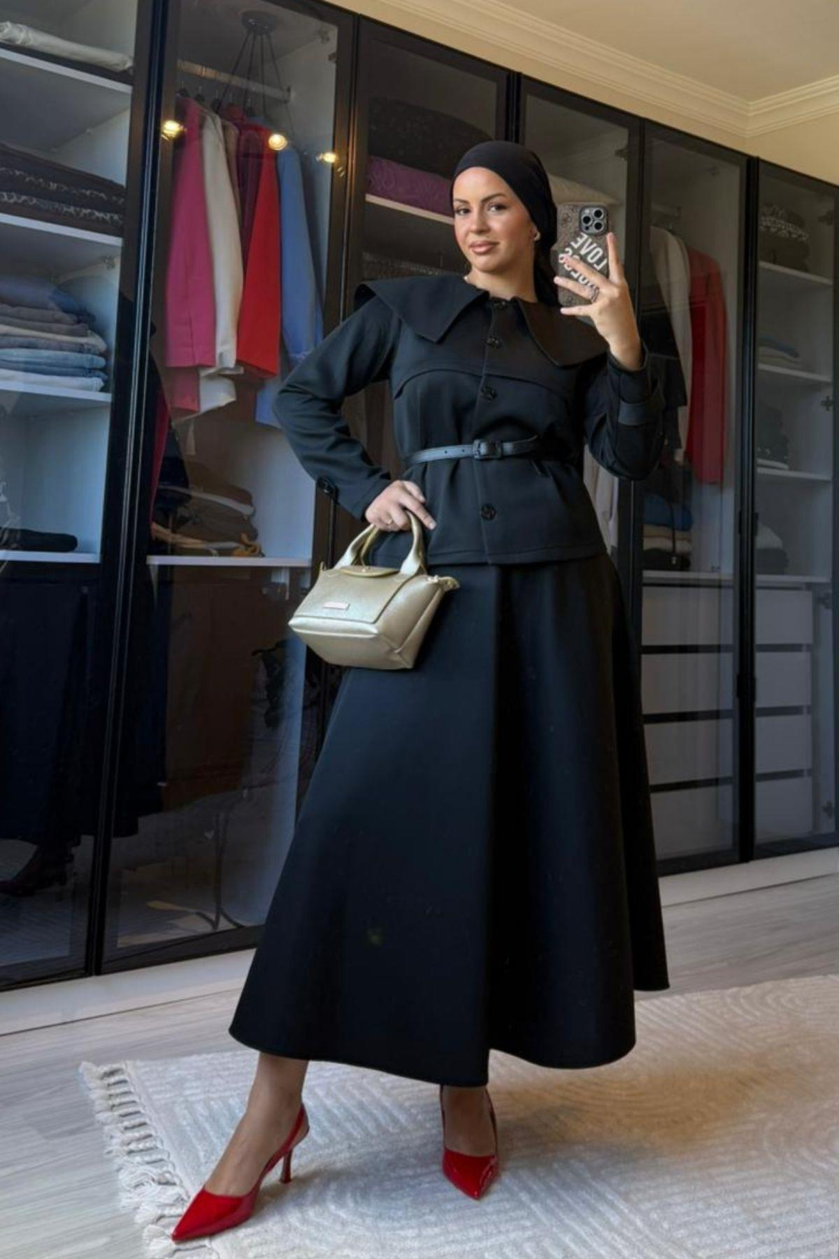 Kadın Siyah Ceketli Kemer Detaylı Etekli Takım (20213)