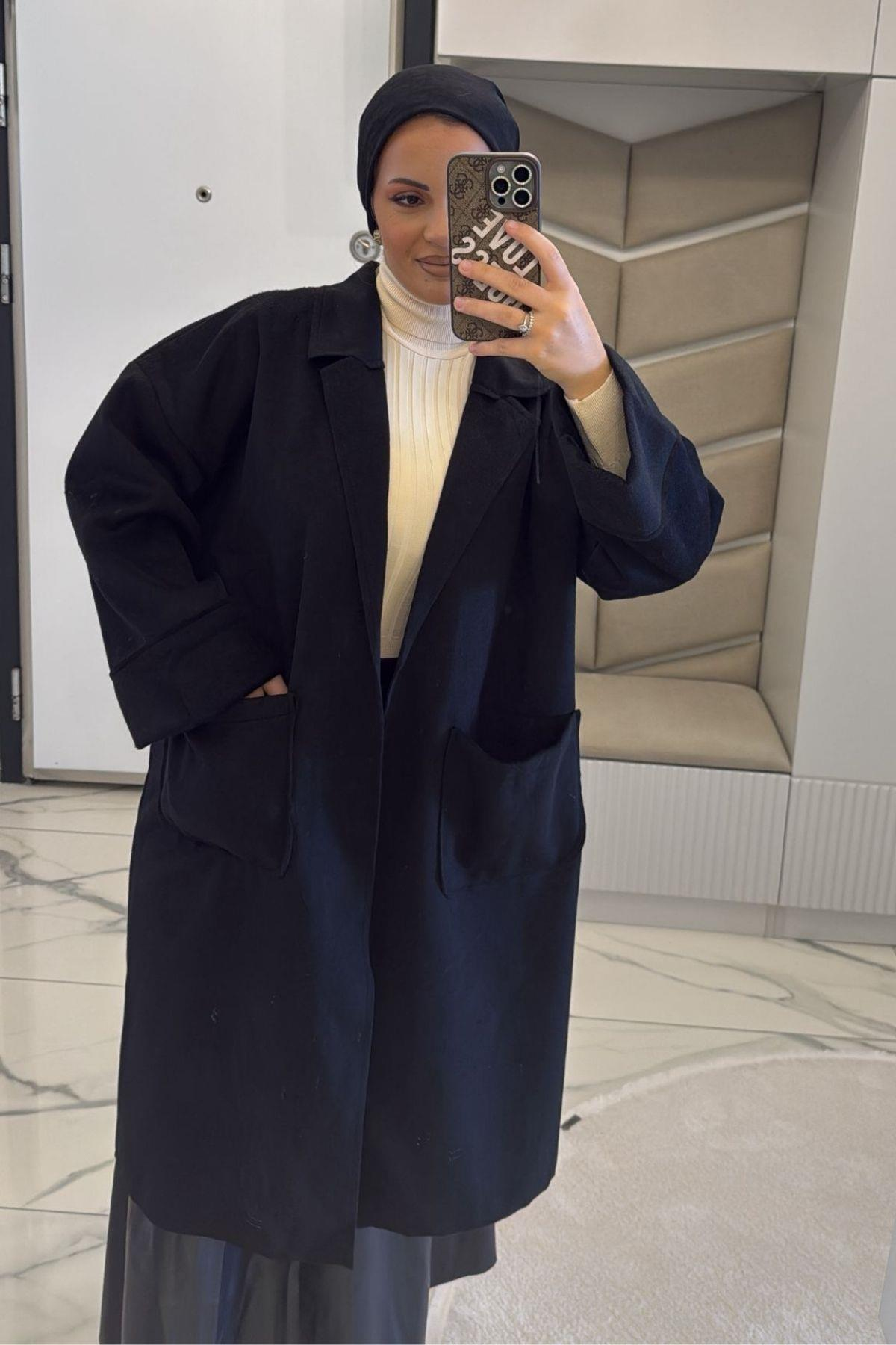 Kadın Siyah Duble Kol Kruvaze Yaka Kaban (3125)